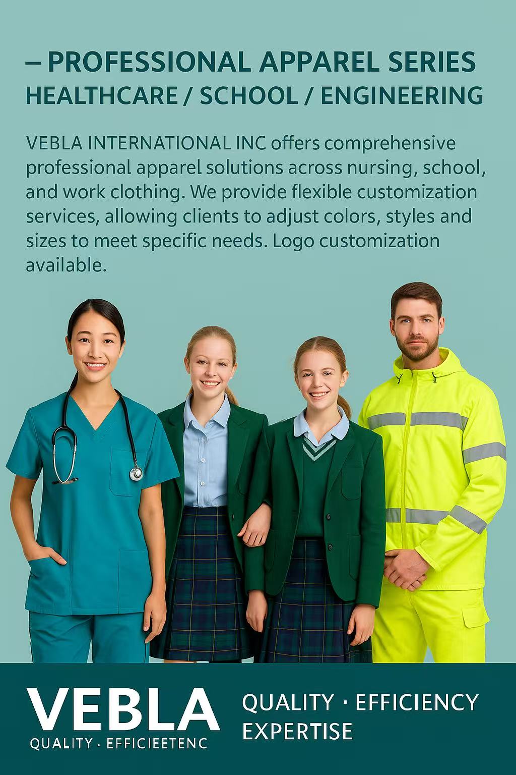 VEBLA INTERNATIONAL INC provides comprehensive professional uniform solutions covering medical wear, school uniforms, and workwear across multiple industries.